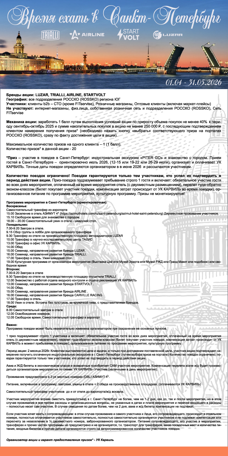 01.04 - 31.05.26 Акция «Приз* экскурсия «PITER GO» за покупку продукции LUZAR, TRIALLI, AIRLINE, STARTVOLT»
